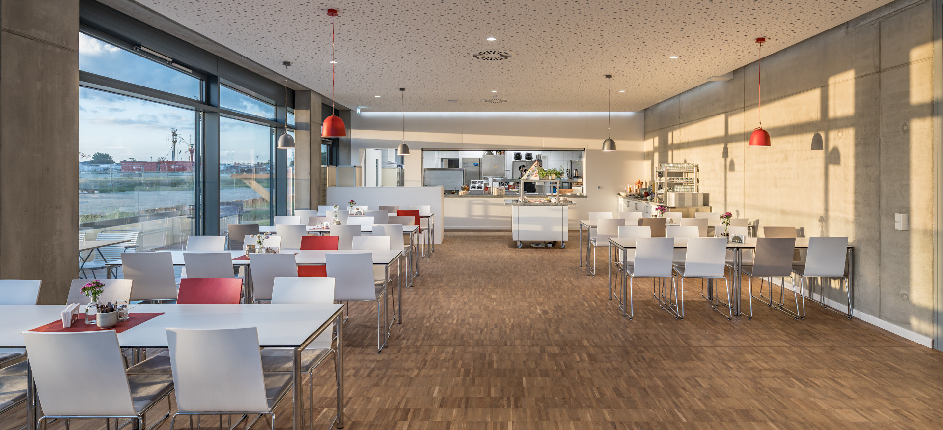 Genießt Eure Mahlzeiten in unserer hellen, modernen Sportmensa mit 124 Sitzplätzen oder im Sommer auf der großzügigen Terrasse mit 50 Plätzen – immer mit direktem Blick auf die Ostsee. Die Terrasse ist auch ein besonderer Ort, um den Tag ausklingen zu lassen.