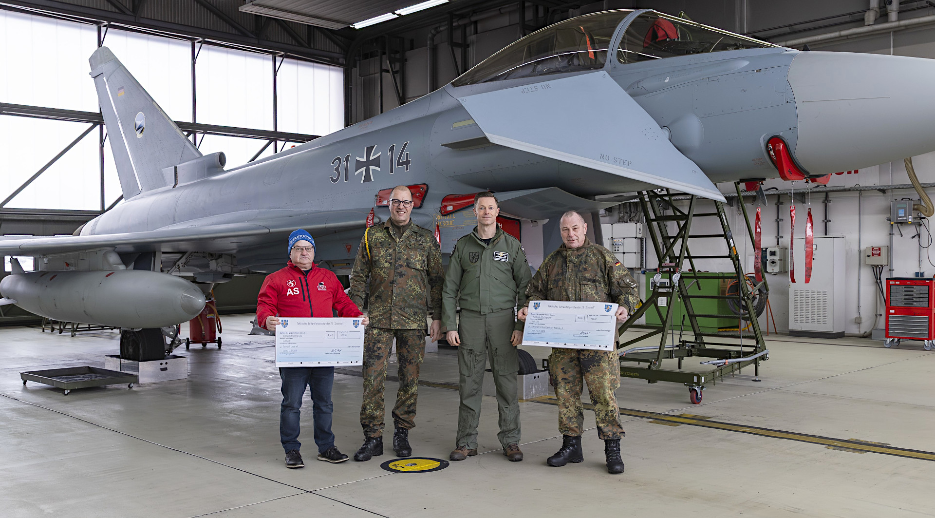 Der Kommodores des Taktischen Luftwaffengeschwaders 73 “S“, Oberst Dominique Gentzsch, überreichte symbolisch Spendenchecks an die beiden Vertreter der ehrenamtlich geführten Vereine.
