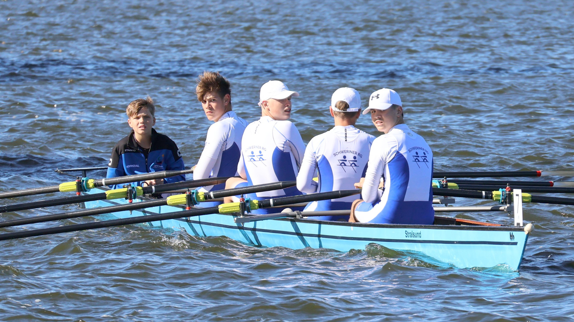 Die große Überraschung ist das U15-Mädchenteam aus Schwerin. Brida Möller, Elisabeth Krüger, Fiona Motullo, Ylvi Hochleutner und Steuerfrau Paula Schöpp erreichen im A-Finale mit dem Gig-Doppelvierer einen zweiten Platz hinter dem Theodor-Heuss-Gymnasium Waltrop. „Das war nicht zu erwarten, es war sehr windig“, sagt Brida. „Beim Rennen hat unser Gegner 500 Meter vor dem Ziel einen Krebs gezogen. Das war unser Glück.“