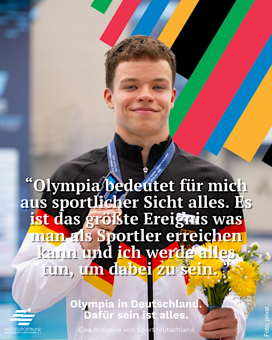 Im Zuge der deutschen Olympiabewerbung stellt der LSB MV junge Sportlerinnen und Sportler aus unserem Bundesland in einer Interviewreihe vor. Sie geben Einblicke in ihren sportlichen Werdegang, ihre Ziele und ihre Motivation. Dabei wird deutlich, welche Bedeutung der Traum von Olympischen Spielen für den Nachwuchs in Mecklenburg-Vorpommern hat.