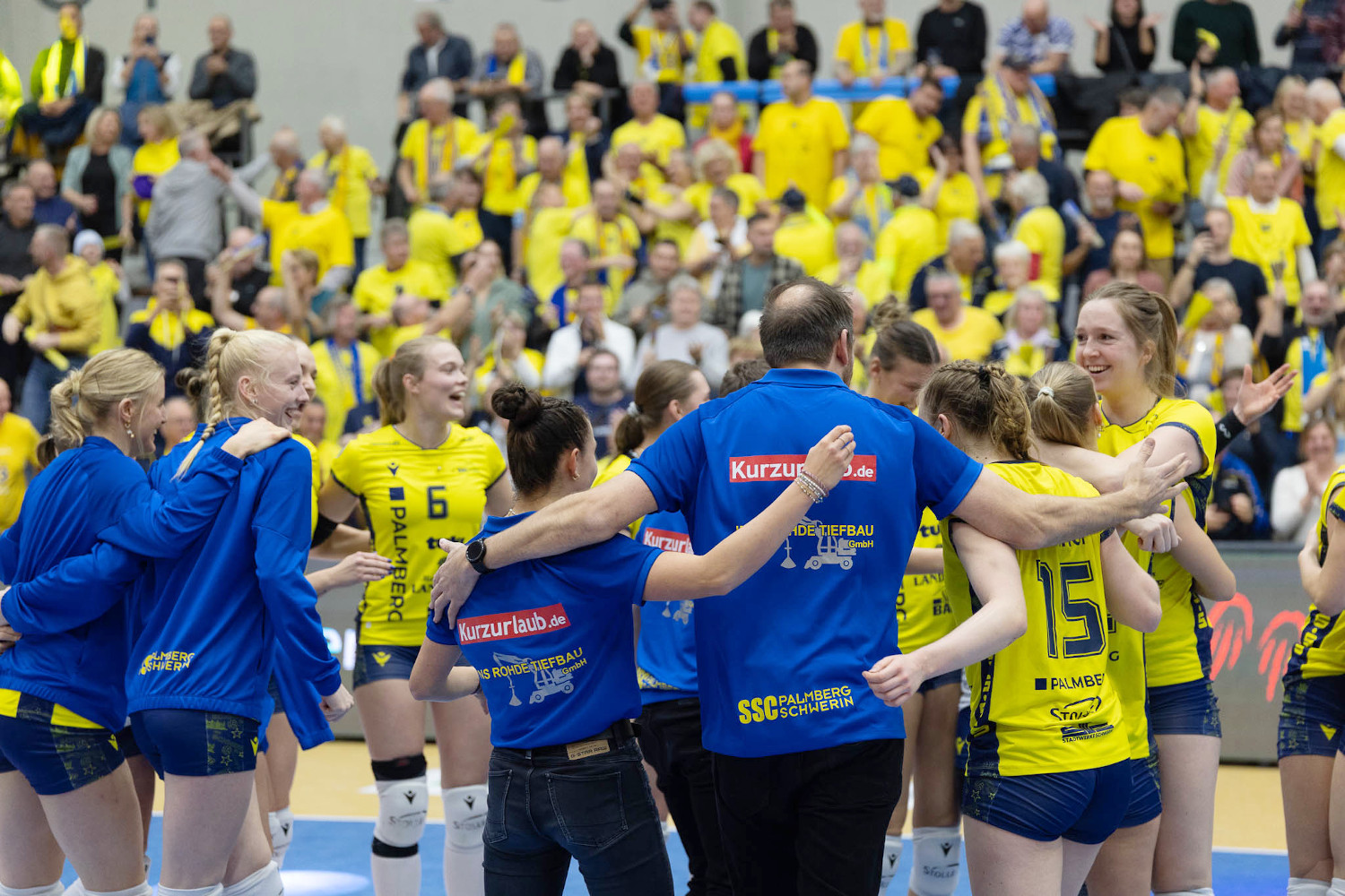 Im entscheidenden fünften Satz blieb – wie so oft im Tiebreak – kaum Zeit zur Entfaltung, weshalb ein guter Start umso wichtiger war. Diesen erwischte der SSC Palmberg Schwerin und legte mit 2:0 vor. Münster antwortete sofort: Isabell Martin glich aus, doch Schwerin holte sich die Führung mit viel Aggressivität am Netz zurück. Der USC blieb dran, profitierte von einer glücklichen Entscheidung am Netz und einem Ass und stellte auf 6:6. Mit einer hauchdünnen 8:7-Führung ging der SSC zum letzten Seitenwechsel des Abends – direkt vor der gelben Wand. Schwerin erhöhte durch einen Münsteraner Angriffsfehler auf 11:9, doch Brianna Ford machte ihren Lapsus sofort wieder gut und blockte zum 11:11-Ausgleich. Die Spannung war nun kaum zu überbieten. Mia Kirchhoff verwandelte zur 13:12-Führung, Münster konterte erneut und erspielte sich nach einem weiteren Angriff von Martin den ersten Matchball des Abends – der jedoch zur Erleichterung der Schweriner im Netz landete. 14:14 – mehr geht nicht! Schwerin bekam anschließend den Ball in der Abwehr nicht sauber kontrolliert und Münster schlug erneut zum Matchball auf. Wieder war es Kirchhoff, die die Nerven behielt. Dann servierte die eingewechselte Iris Vos druckvoll und Schwerin erarbeitete sich den ersten eigenen Matchball. Münster konnte diesen noch abwehren, doch der SSC verwandelte schließlich die zweite Chance.